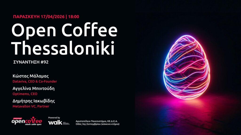 Παρασκευή 8 Μαΐου, από τις έξι το απόγευμα μέχρι αργά, σας περιμένουμε στο Μουσείο Μπενάκη της οδού Πειραιώς για καφέ και startup networking στο τελευταίο Open Coffee της σεζόν!