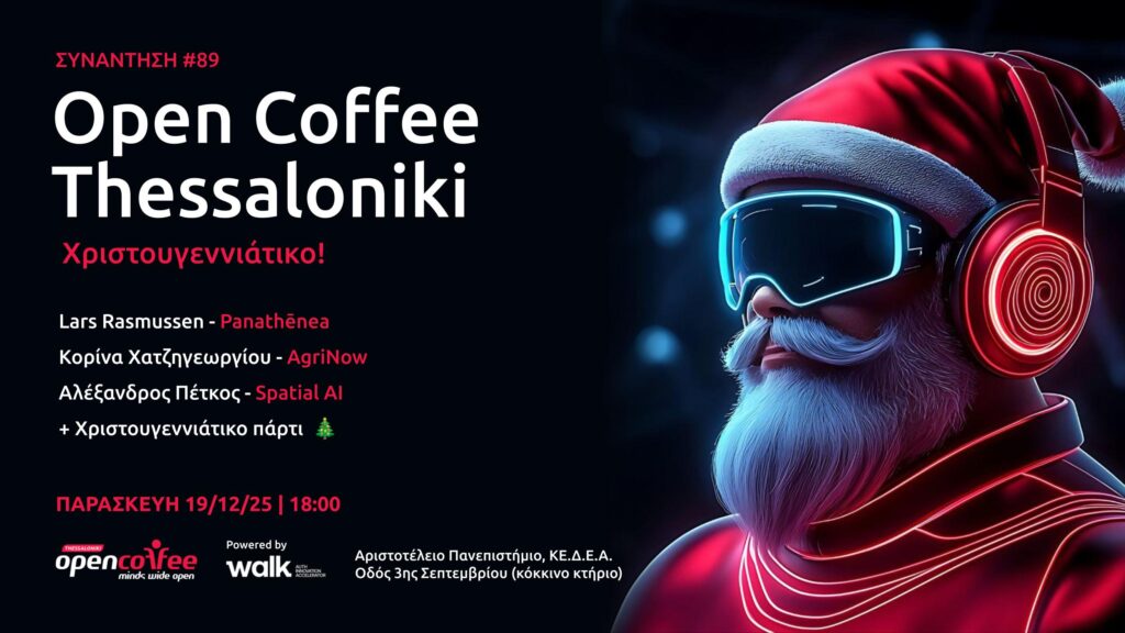 Την Παρασκευή 19/12 στις 18:00 η startup κοινότητα της Θεσσαλονίκης συναντιέται για Χριστουγεννιάτικο Open Coffee με καταπληκτικές ομιλίες, πολλή έμπνευση, πάρτι με glühwein, και networking με τα πιο ενδιαφέροντα άτομα της πόλης.